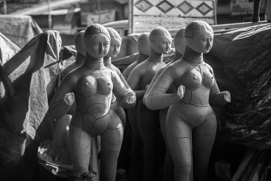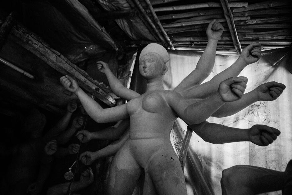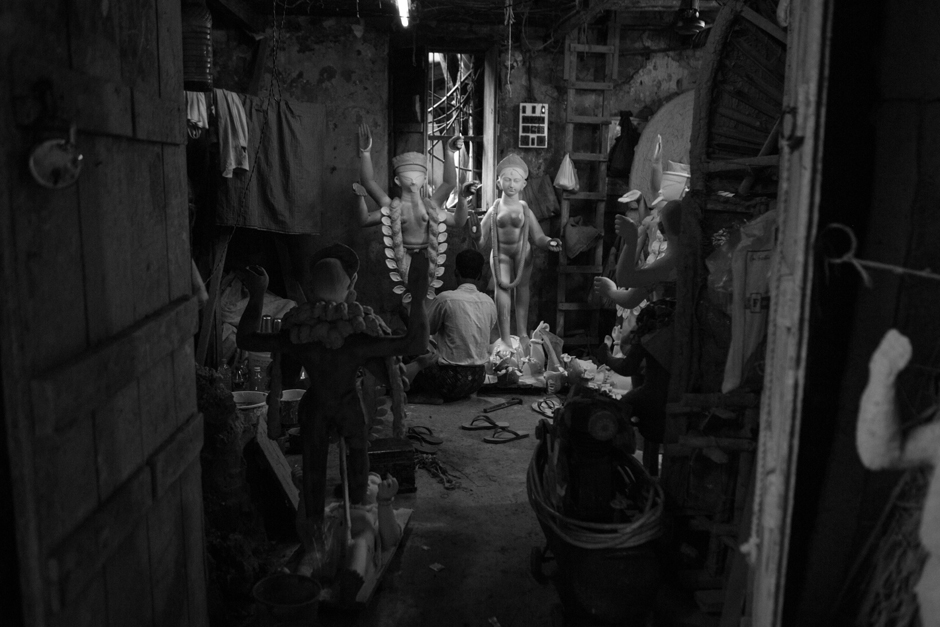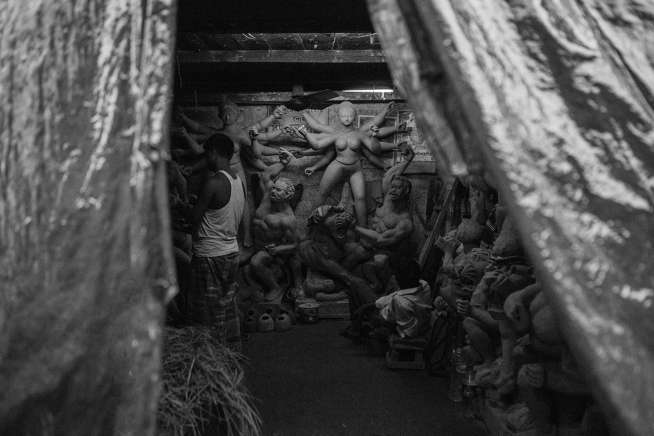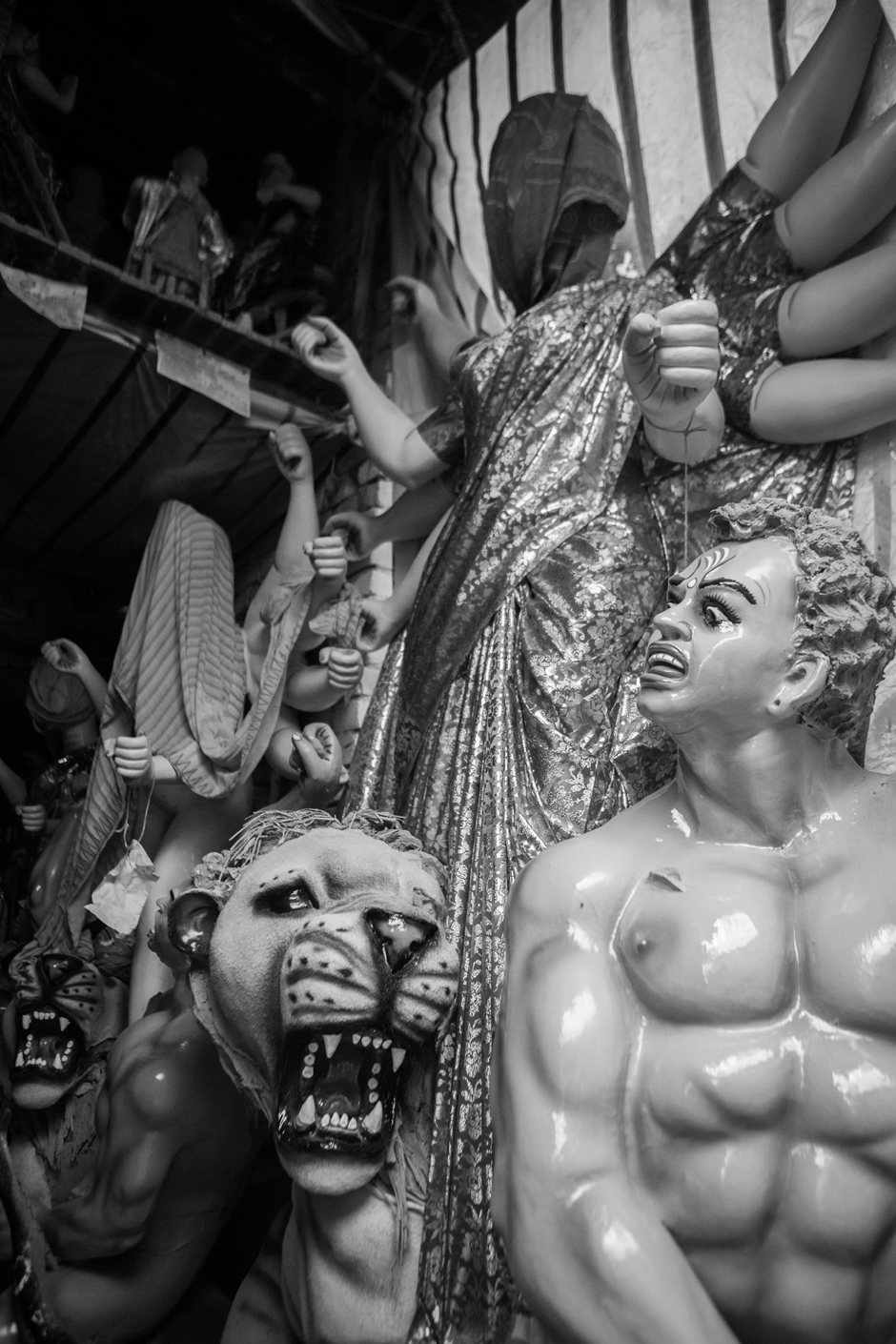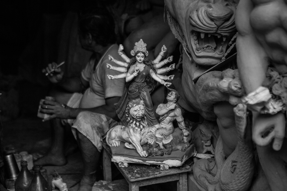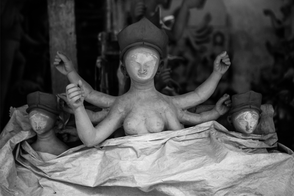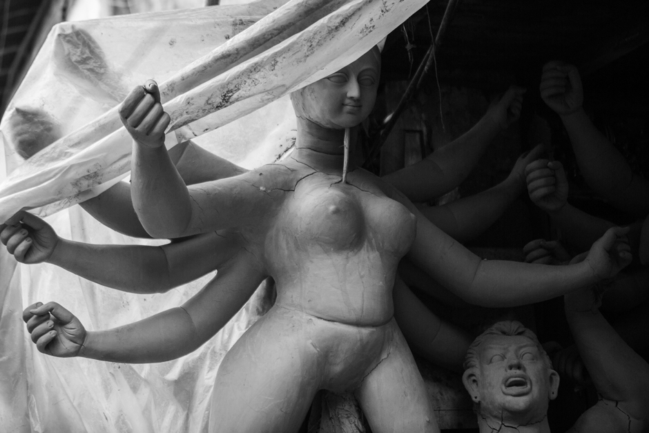 In the far North side of Kolkata, an unassuming alley opens up to a maze of workshops where artisans operate year-round, sculpting idols from clay or fiberglass. Many of these massive sculptures are on display for just a few days during Hindu holidays before being submerged into Ganga water in order to release the divinity back into her spiritual realm. Some say she inhabits the vessel of an idol once the eyes have been painted. From that moment, a cloth is placed over the face until the celebration officially begins and the goddess can be revealed to her worshippers.