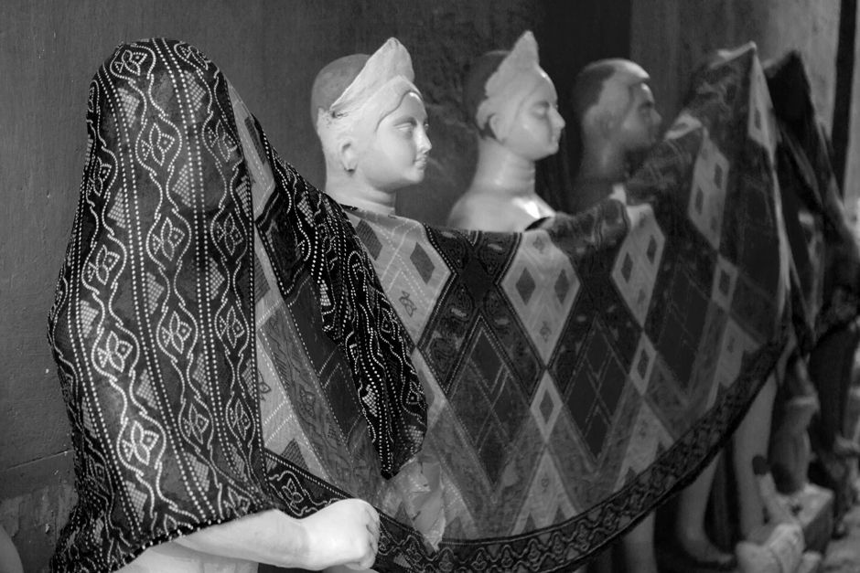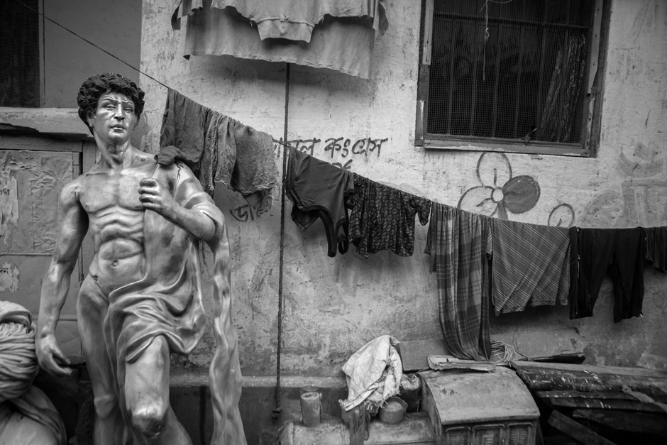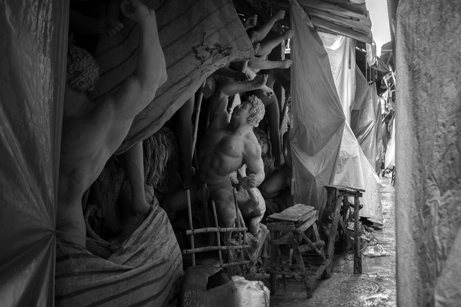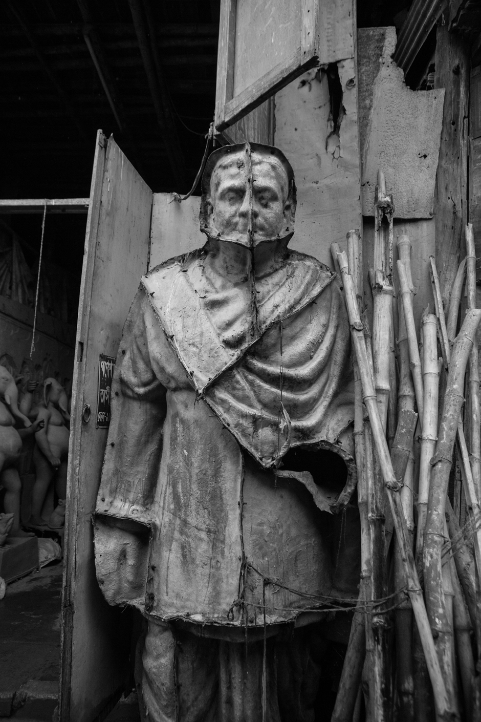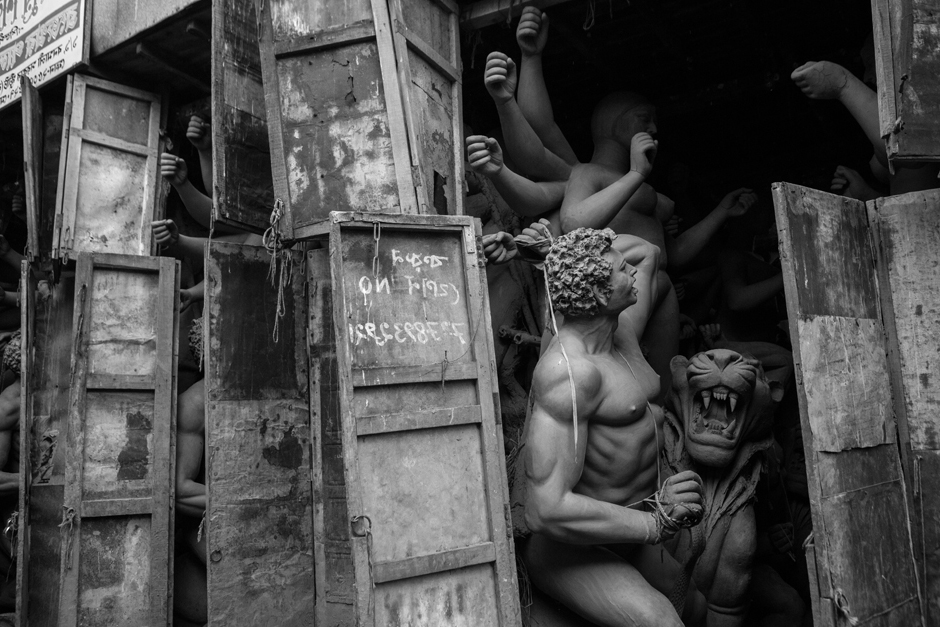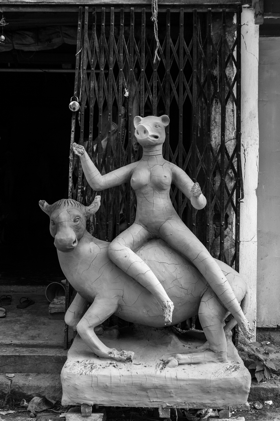 In the far North side of Kolkata, an unassuming alley opens up to a maze of workshops where artisans operate year-round, sculpting idols from clay or fiberglass. Many of these massive sculptures are on display for just a few days during Hindu holidays before being submerged into Ganga water in order to release the divinity back into her spiritual realm. Some say she inhabits the vessel of an idol once the eyes have been painted. From that moment, a cloth is placed over the face until the celebration officially begins and the goddess can be revealed to her worshippers.